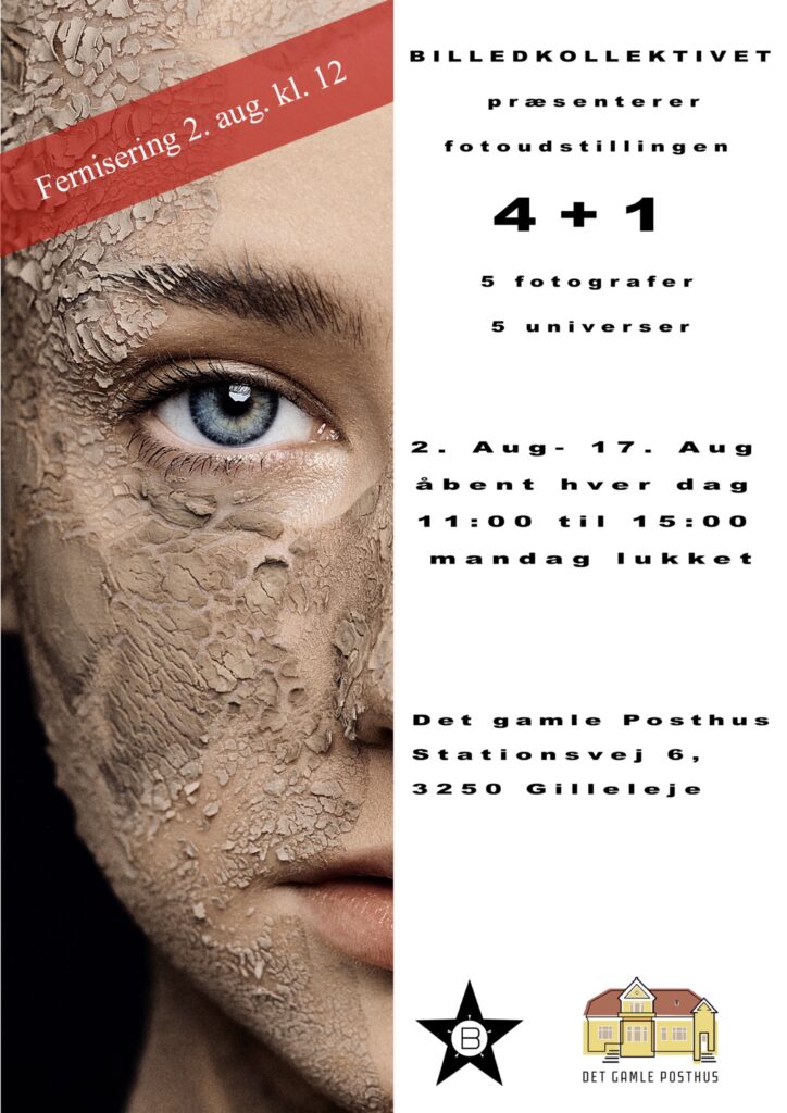 Fra lørdag den 2. august til 17. august 2025 inviterer Billedkollektivet indenfor i Det Gamle Posthus i Gilleleje. Her præsenteres udstillingen 4+1 – en sanselig og ærlig rejse gennem fem forskellige fotografiske blikke, samlet ét sted.
